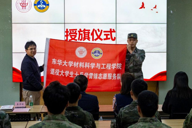成立仪式上,秦泽峰向退役老员工士兵学雷锋志愿服务队授旗。服务队队长、卓越高分子2002班韩昊志代表全体成员发出学雷锋倡议,号召大家积极投身到学雷锋志愿服务活动中,展现退役老员工士兵的价值追求,做一颗永不生锈的螺丝钉,以实际行动书写新时代的雷锋故事。
